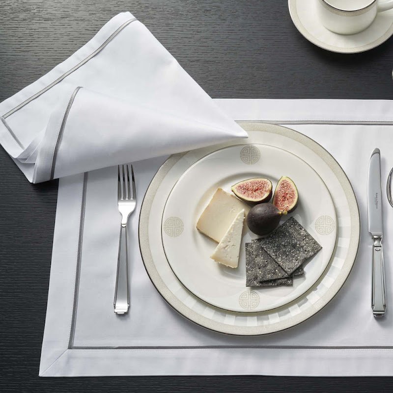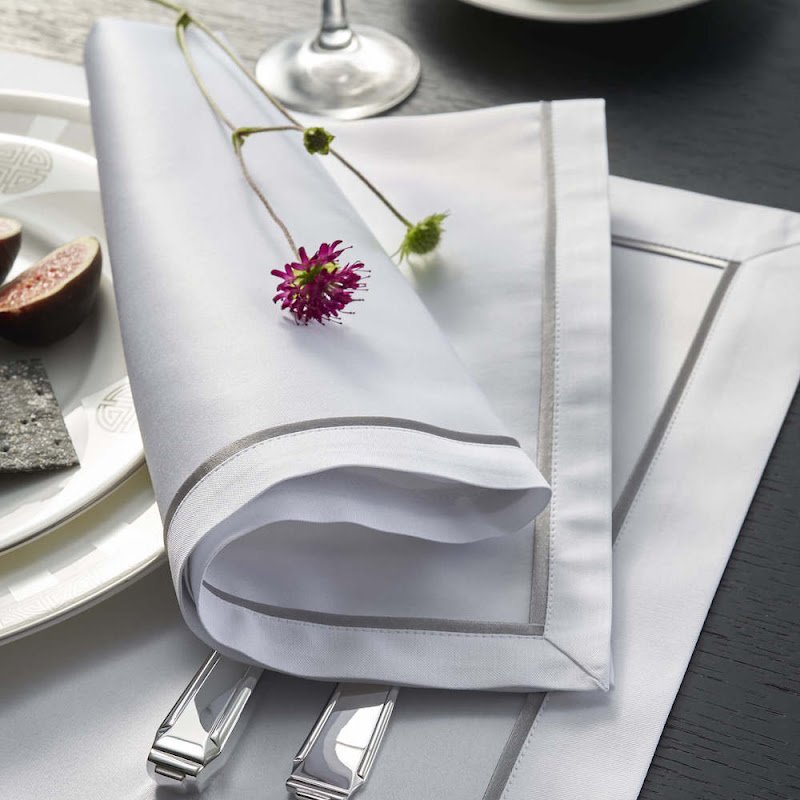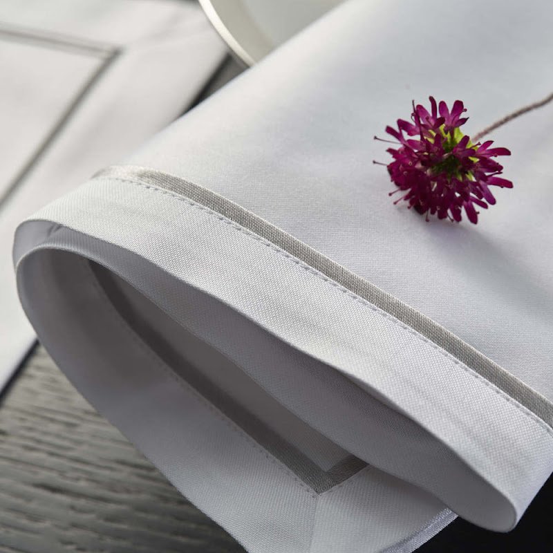 Placemats, napkins and table cloths are made to order in your preferred sizes and fabric, with a satin piping a colour of your choice. This simple piped linen is ideal to have it enhanced with a logo especially nice in in the same colour as the piping.