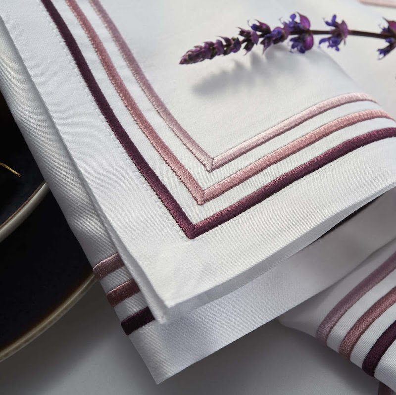 Placemats, napkins and table cloths are made to order in your preferred sizes and fabric, with embroidery in a colour of your choice.